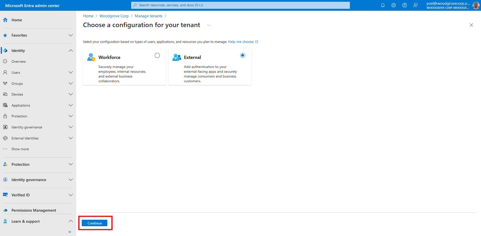 Select External, and then select Continue.