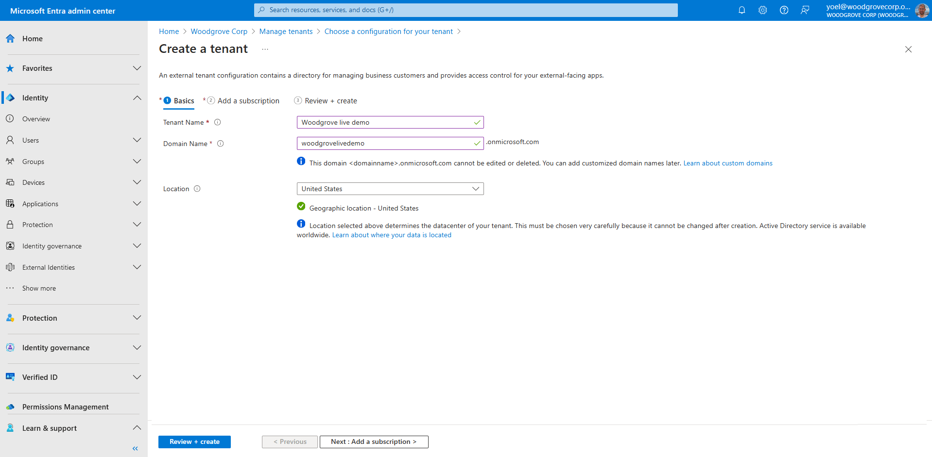 Type your desired Tenant Name (for example Woodgrove live demo).