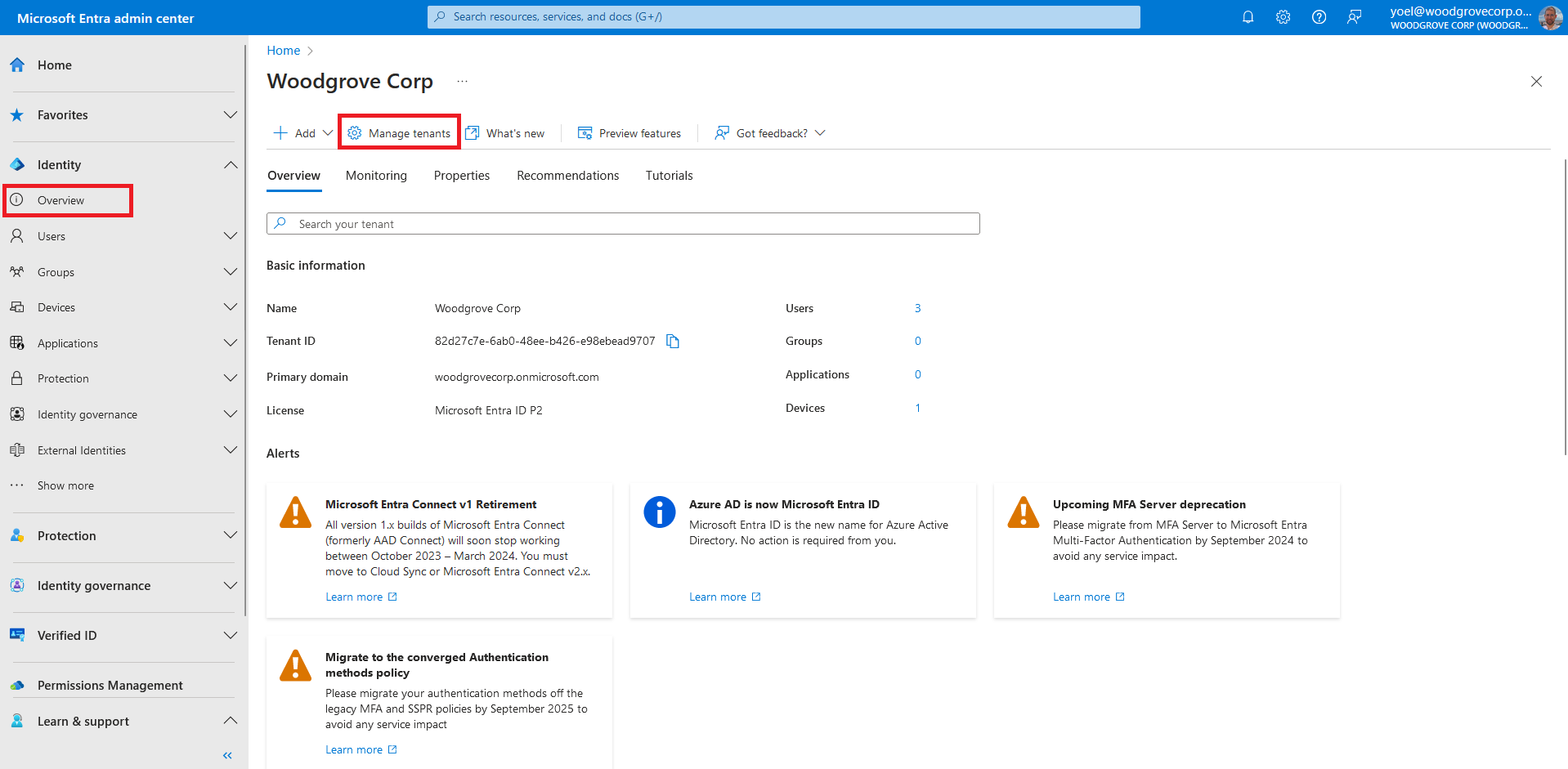 and browse to Identity > Overview . Then, select Manage tenants.