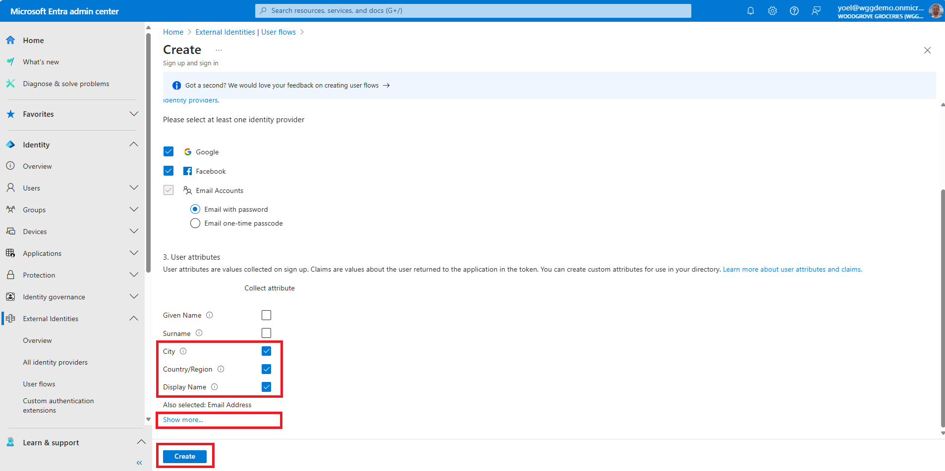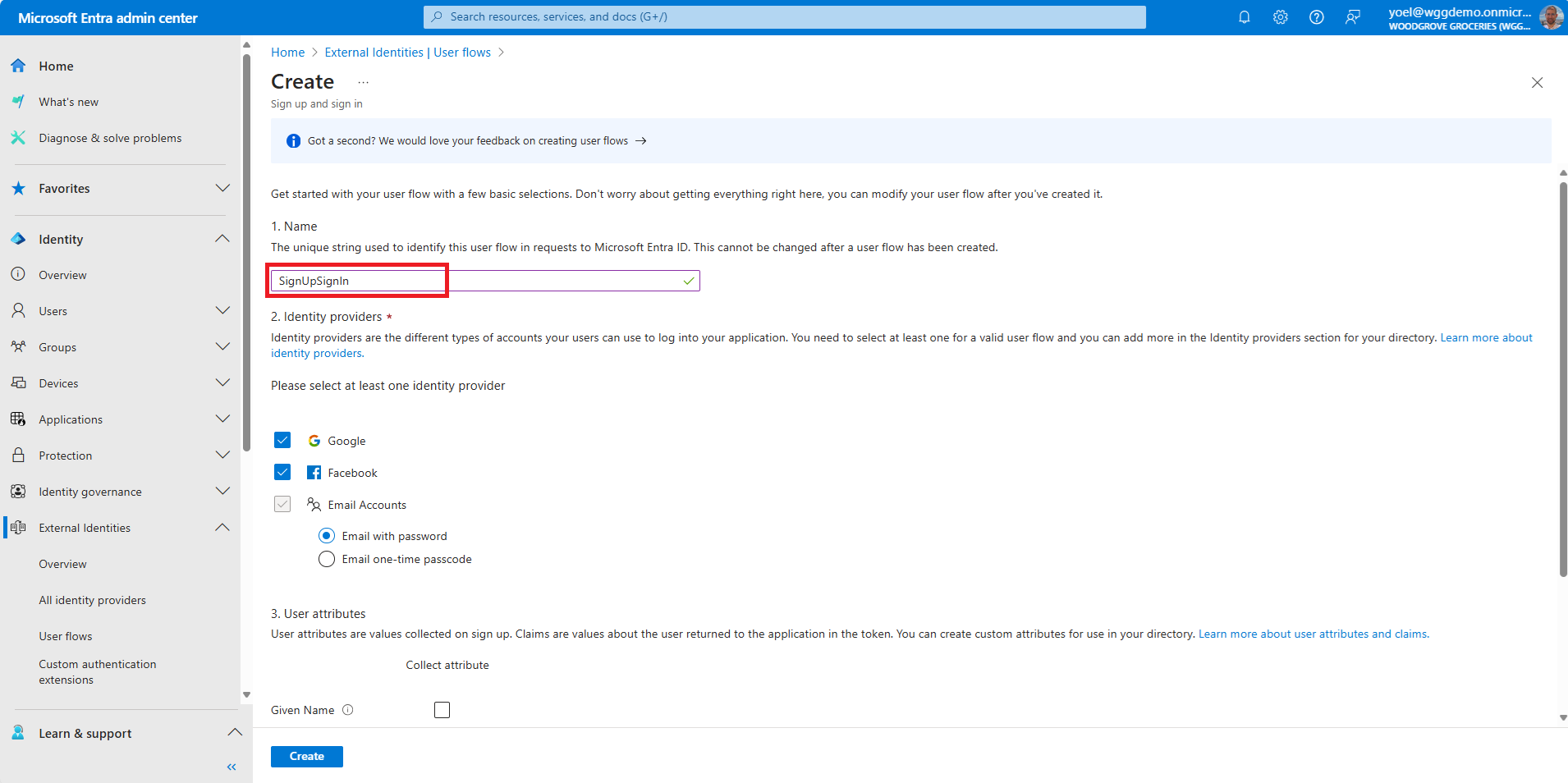 On the Create page, enter a Name for the user flow (for example, "SignUpSignIn").
