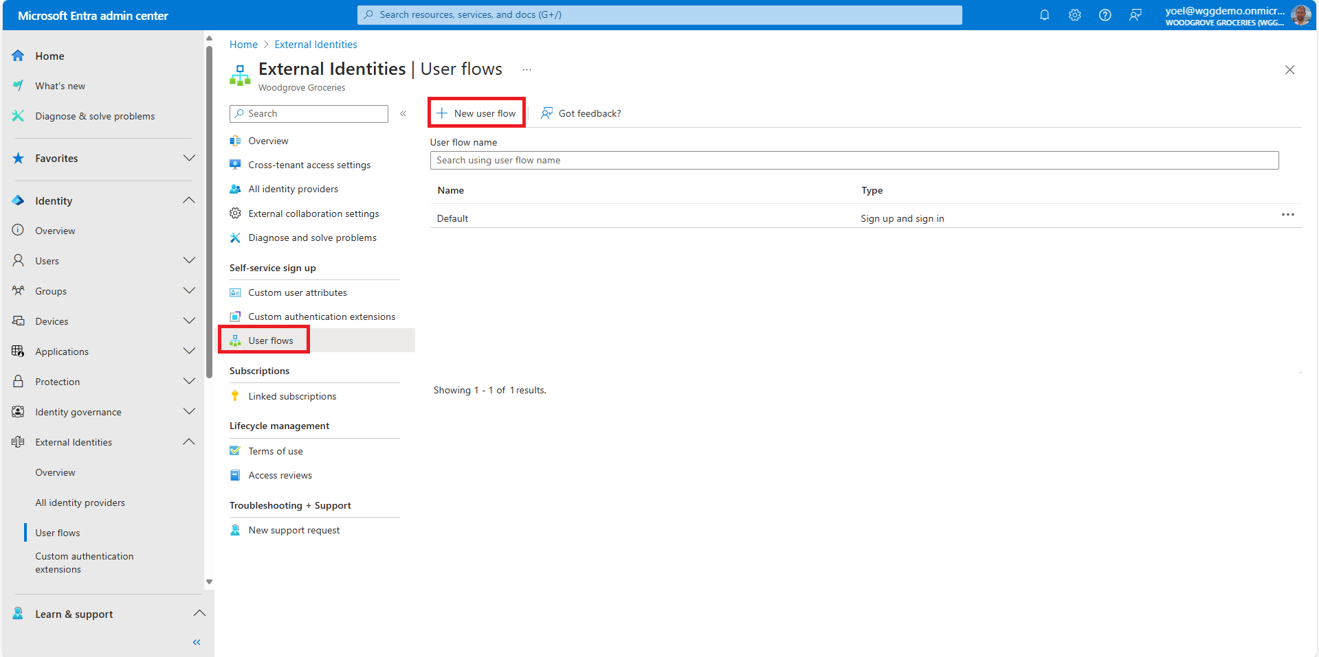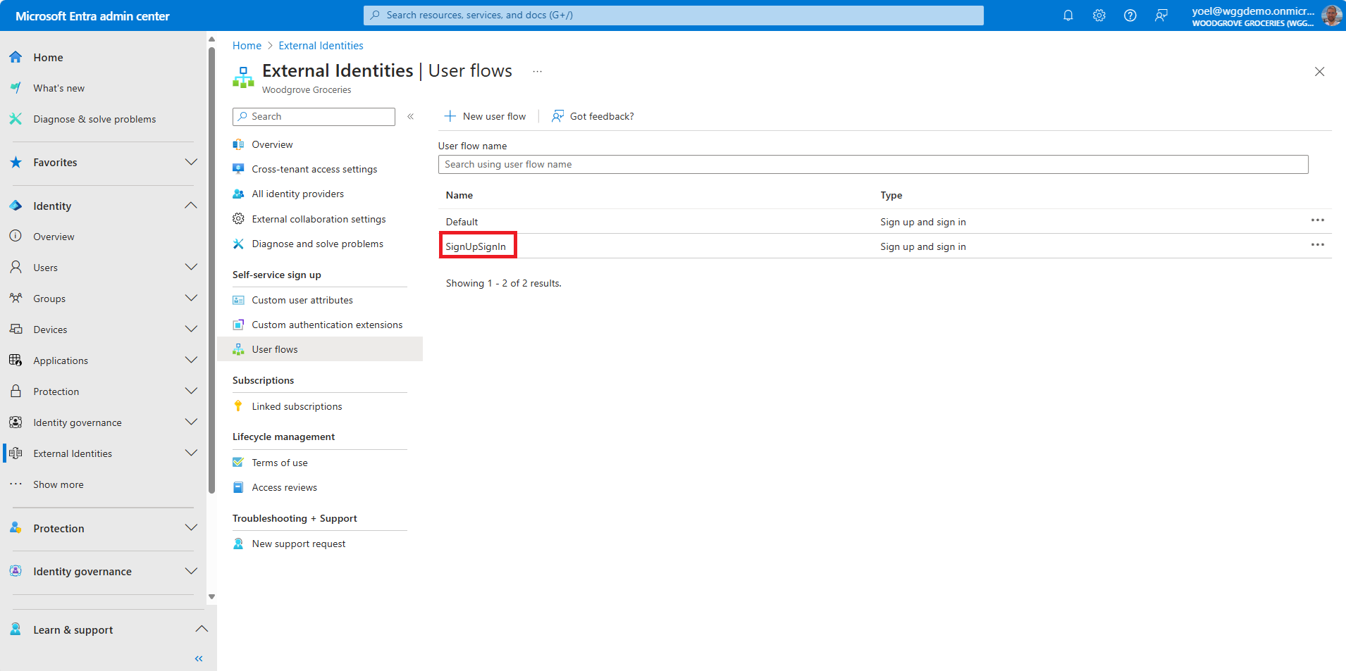 To create a sign-up and sign-in user flow, sign in to the Microsoft Entra admin center
