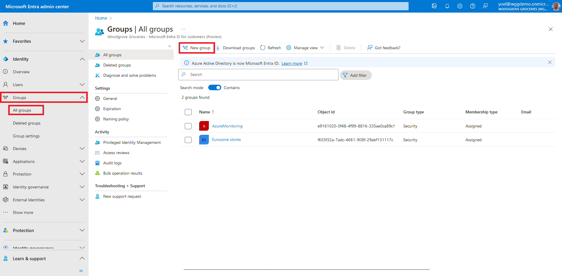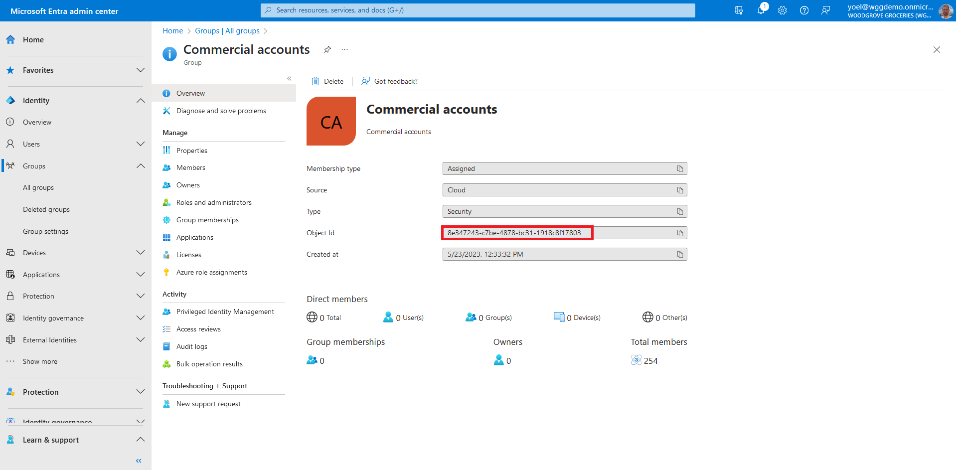 After the group is creaetd, take a note of the security group object id. You will use the ID to