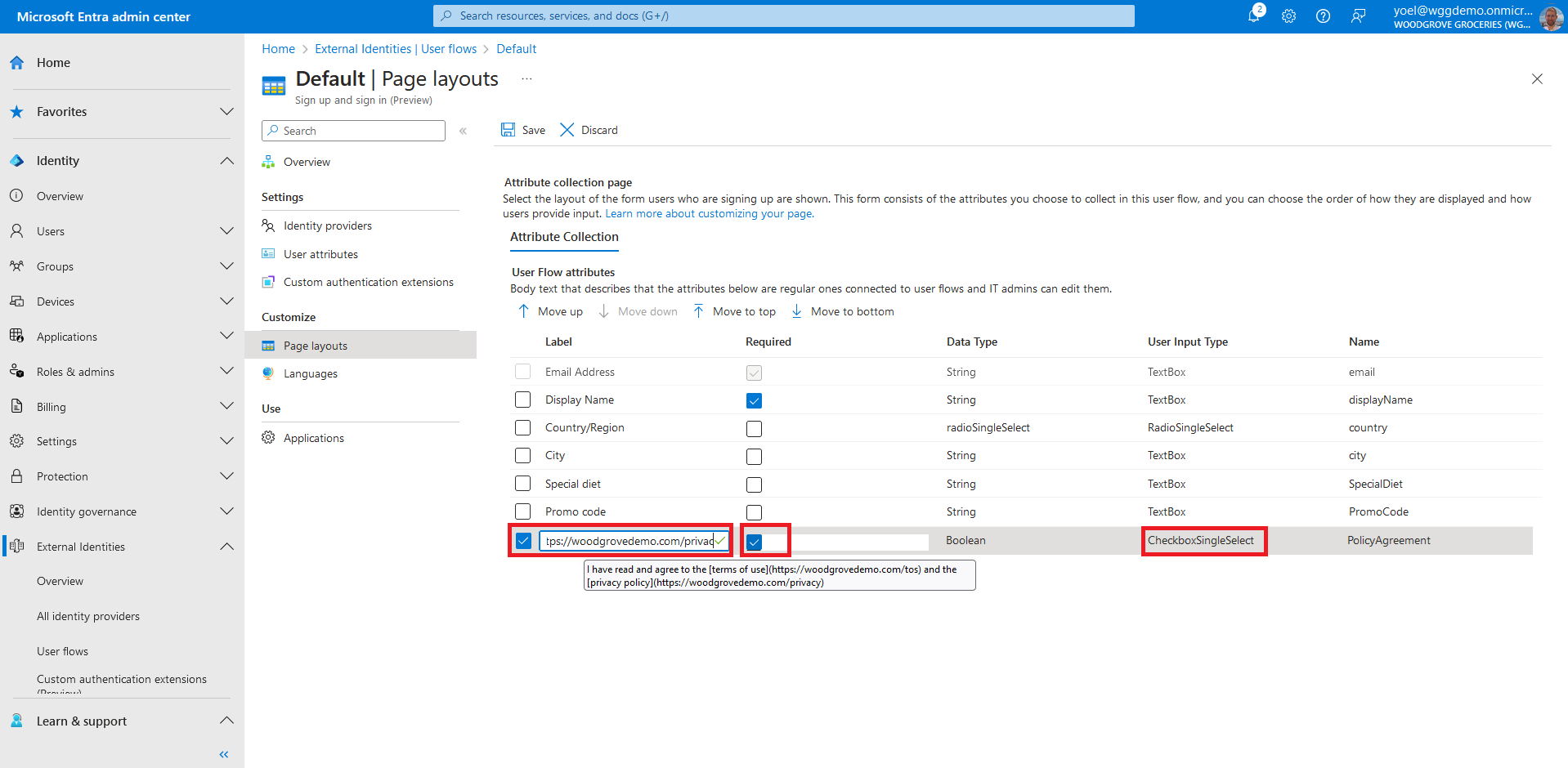 column and modifying the text with the following Markdown language to add hyperlinks. I have read and agree to the [terms of use](https://woodgrovedemo.com/tos) and the [privacy policy](https://woodgrovedemo.com/privacy).