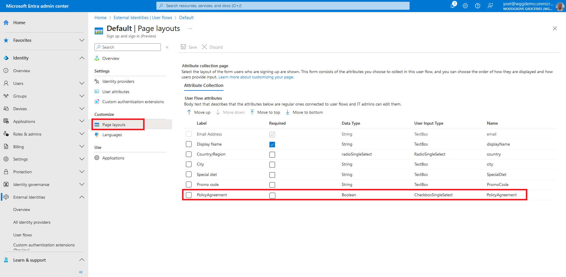 The PolicyAgreement attribute you have chosen to collect appears in the list.
