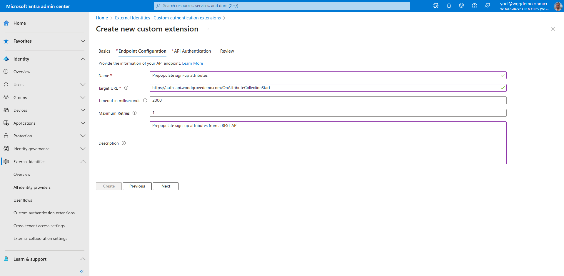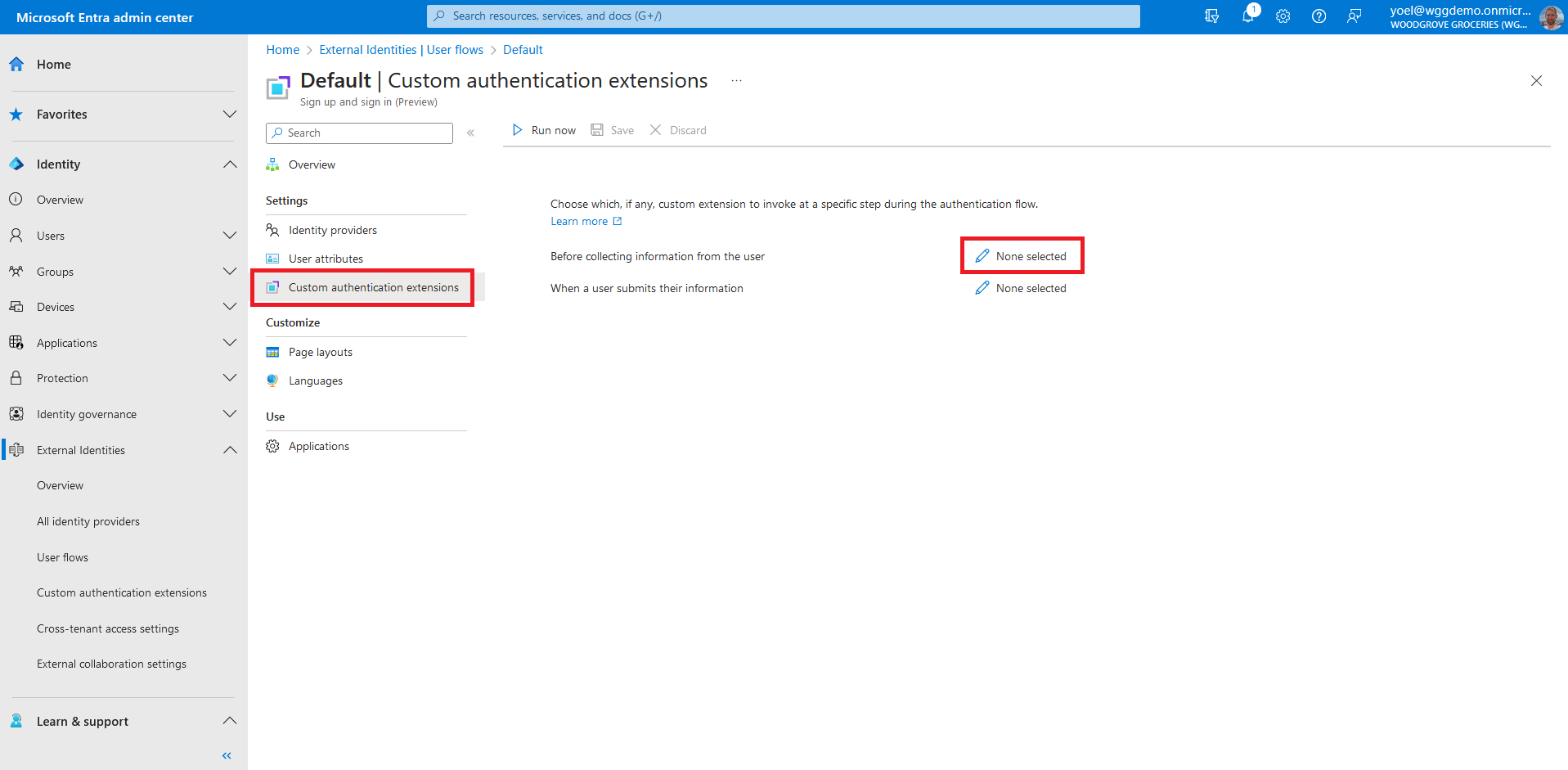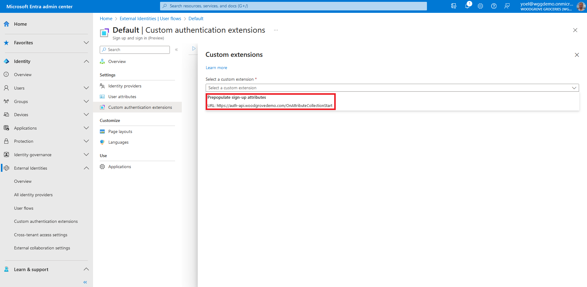 and browse to External Identities > Custom authentication extensions.