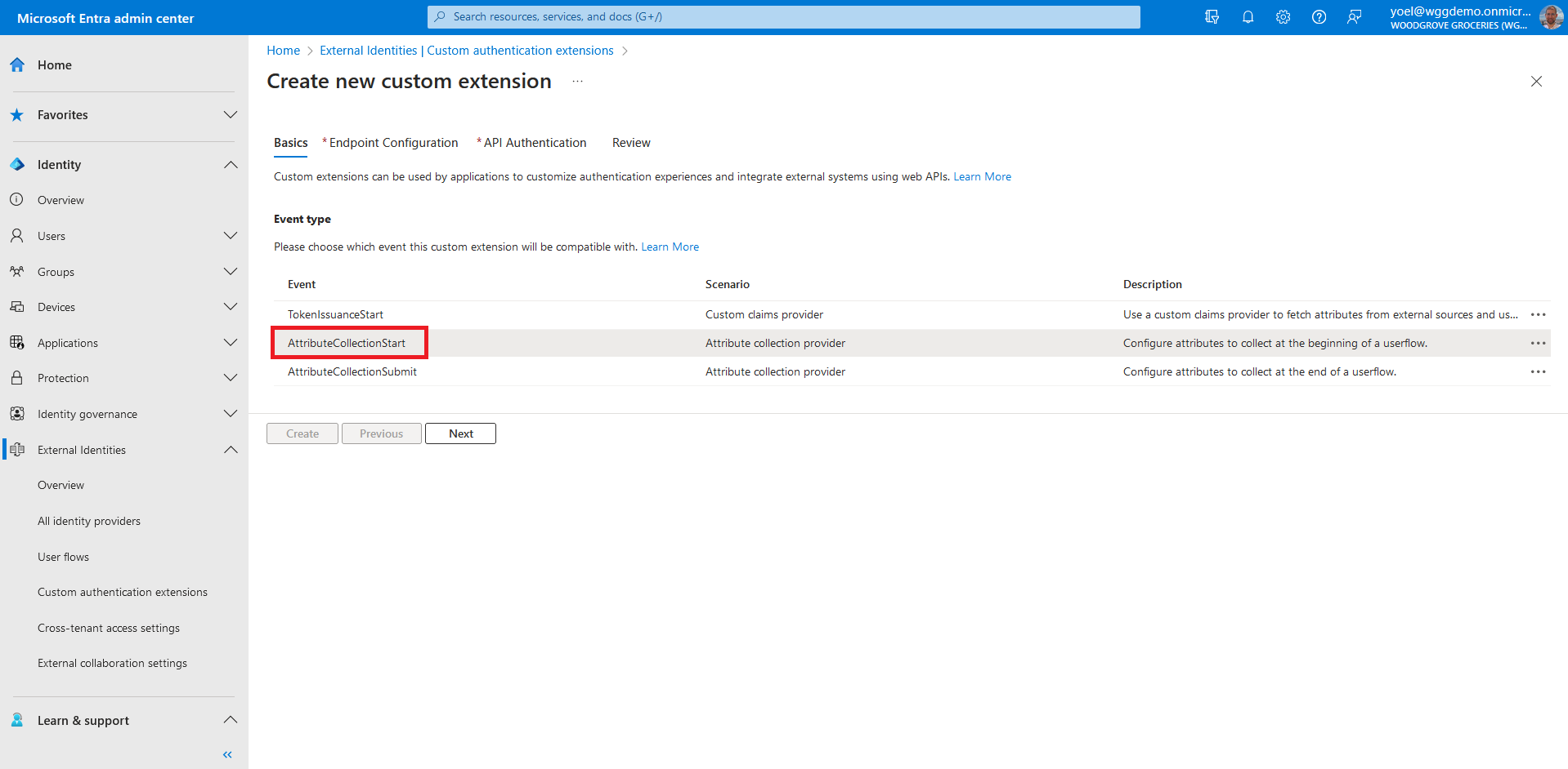 You created a custom authentication extension type of OnAttributeCollectionStart. Then