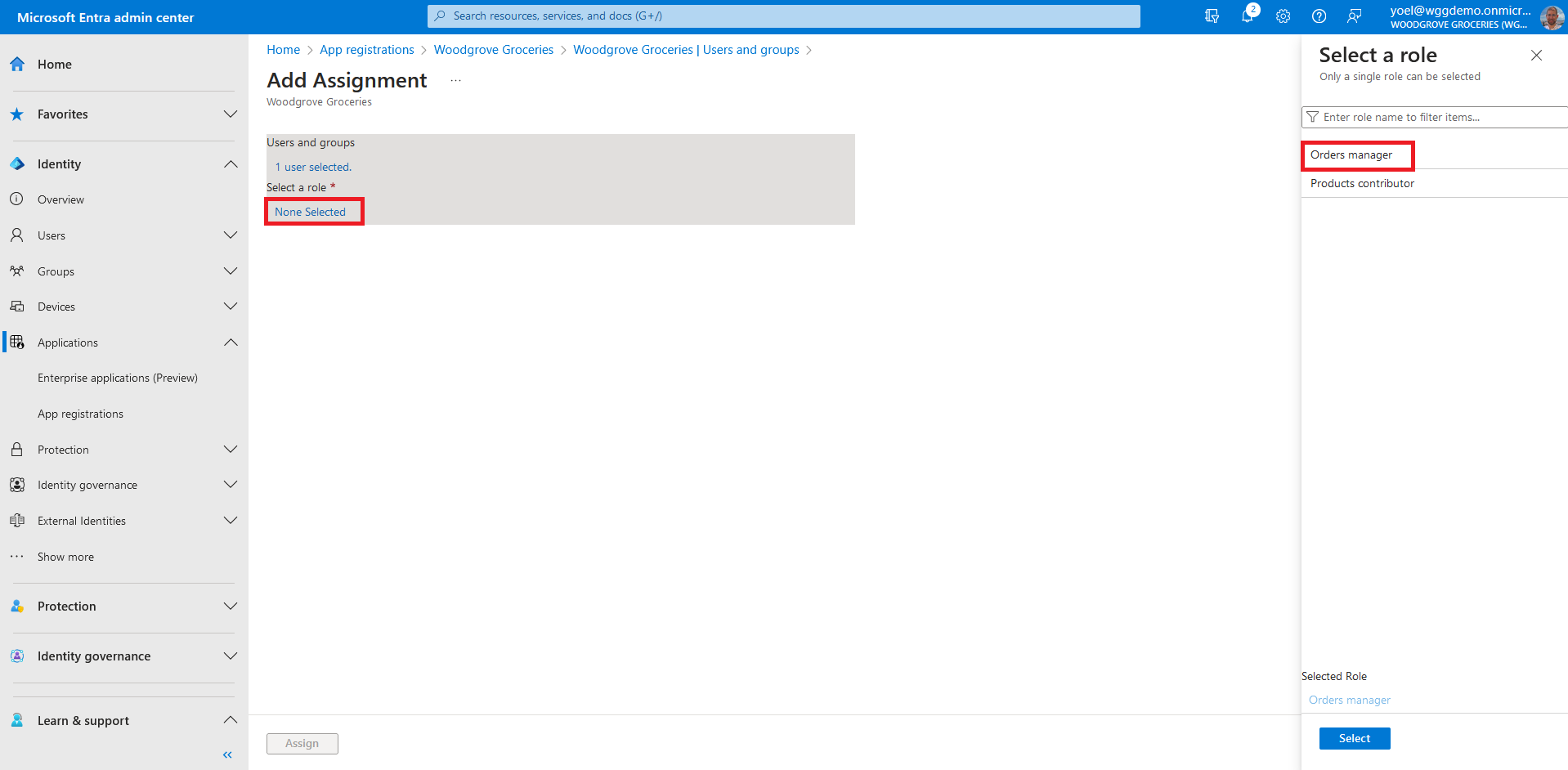 In the Add Assignment pane, choose Select a role. All the roles you defined for