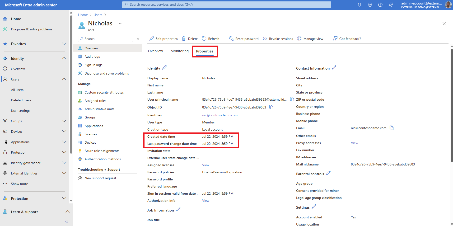 Find information about the user last activity, including: when the account was created, last time user signs-in (sign-in activity) and